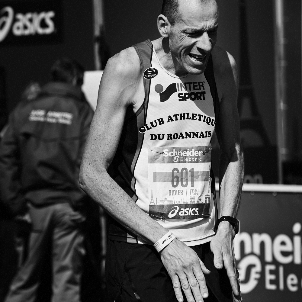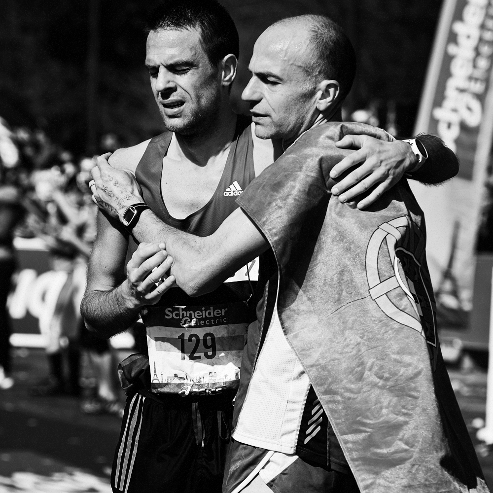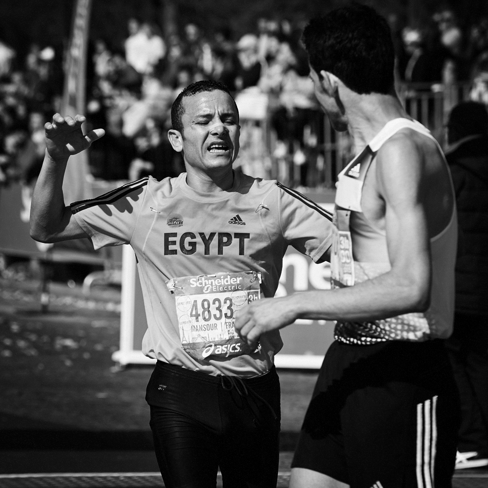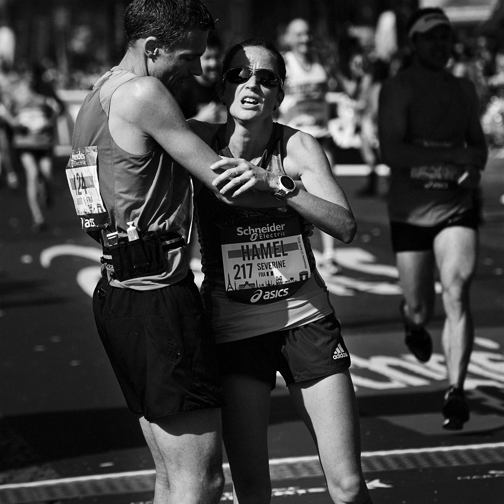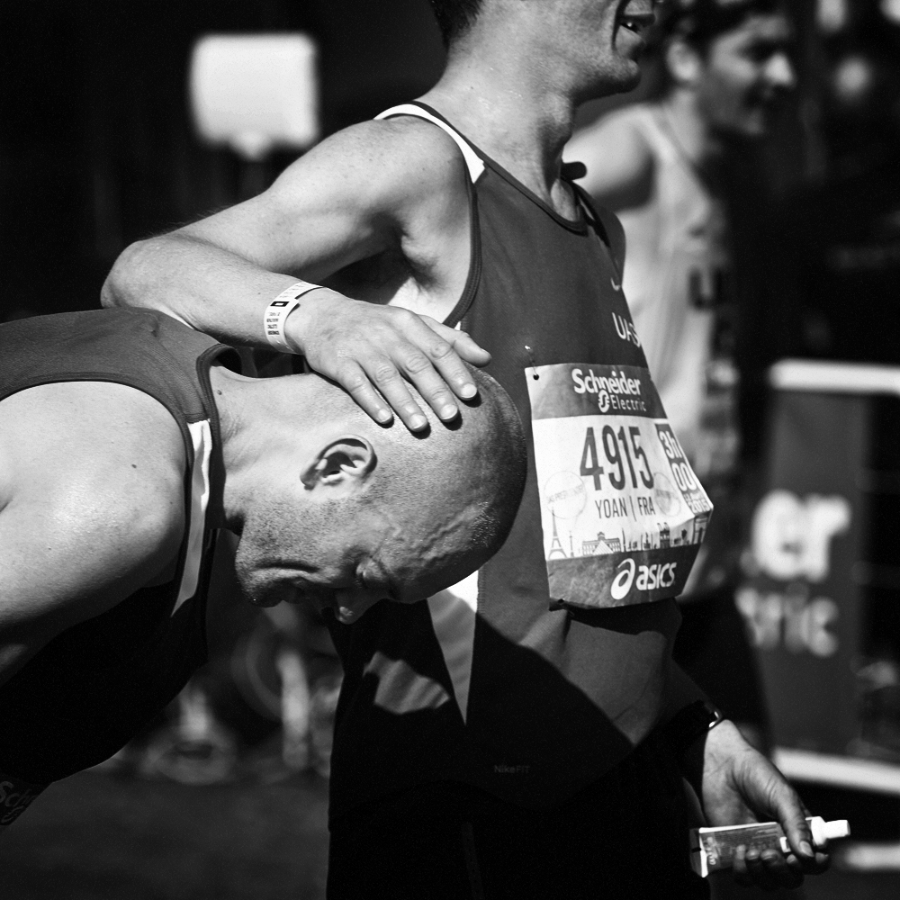 Sur la ligne d’arrivée du Marathon de Paris, les expressions de joie et de douleurs se mêlent et se partagent.