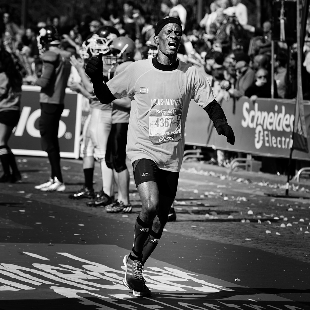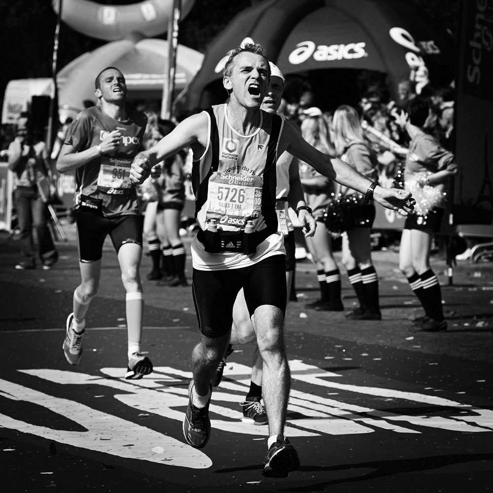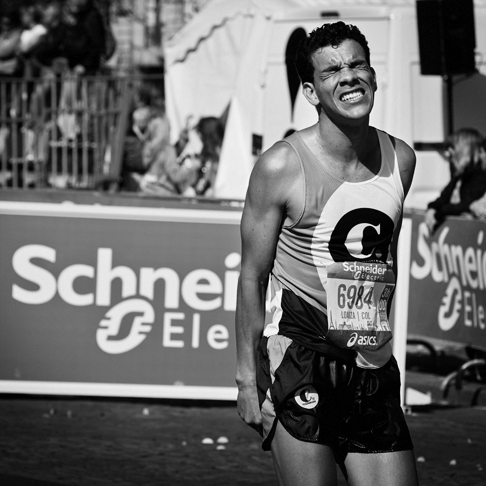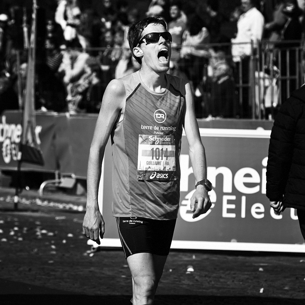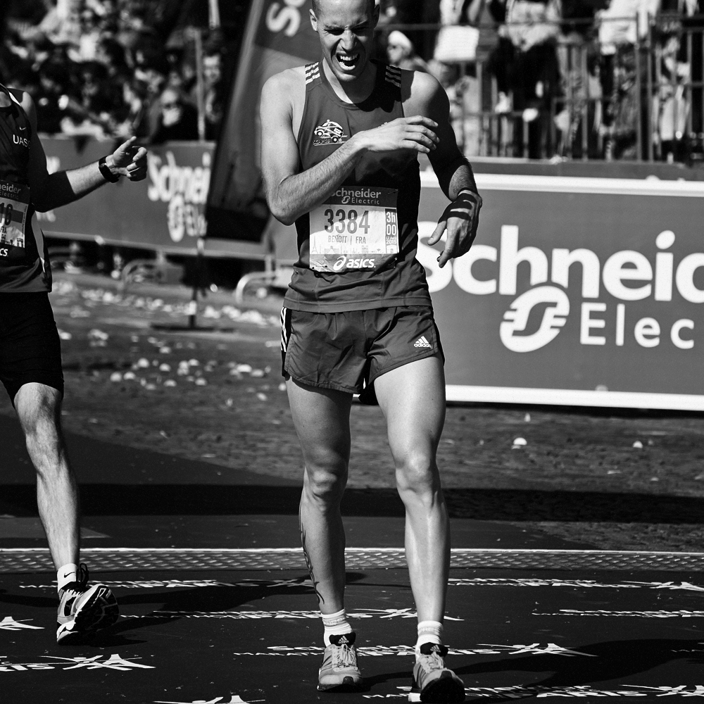 Sur la ligne d’arrivée du Marathon de Paris, les expressions de joie et de douleurs se mêlent et se partagent.